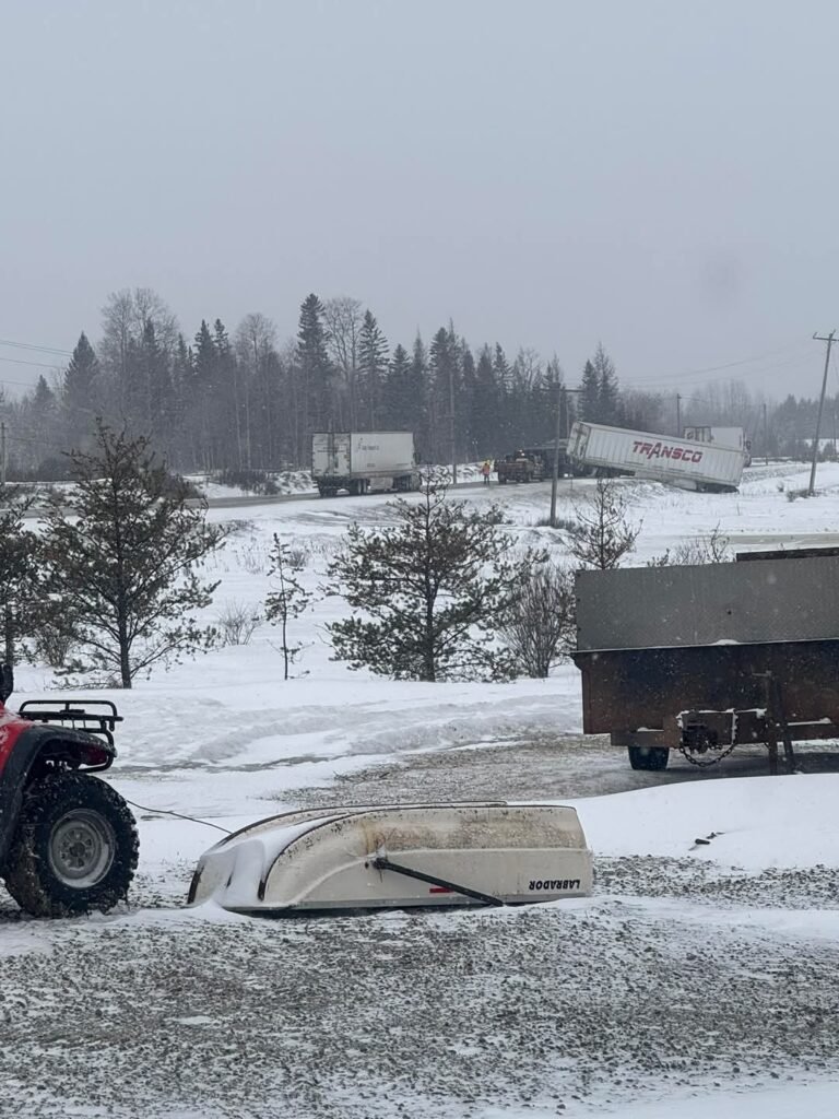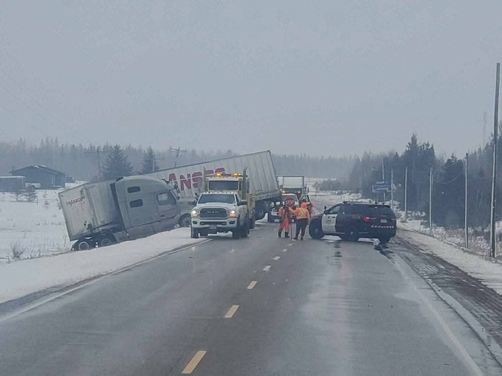 trans canada highway 11 blocked with jackknife transport truck into the ditch near kapuskasing, Ontario. The emergency crews are on scene dealing the situation